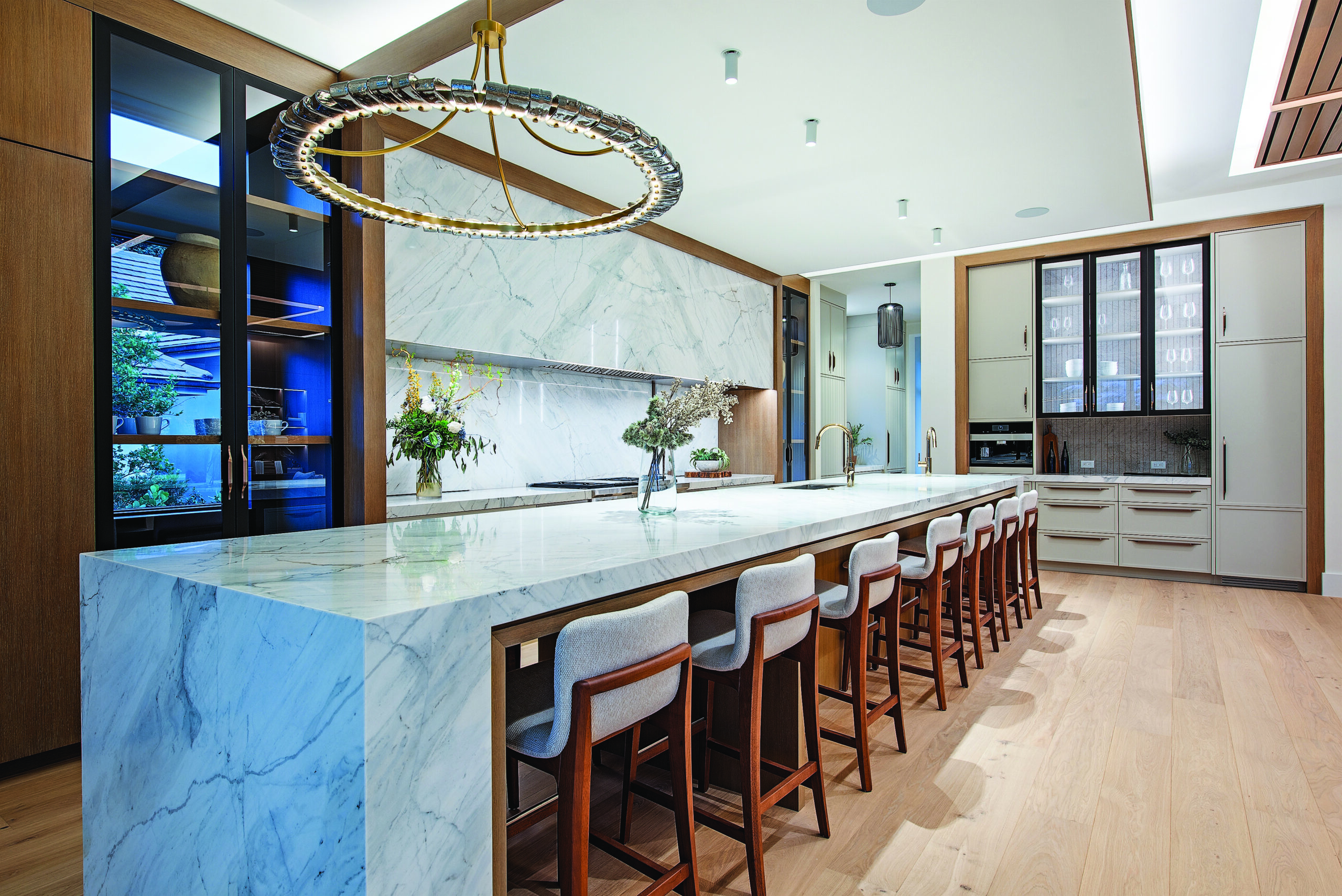 Mike and his team are driven by their motto, “living beautifully with intent,” which is all about luxurious materials, and a thoughtful approach to how the design will function to allow homeowners to live well in their spaces. The bells and whistles you don’t see are just as important as the ones you do. “This house is filled with details that require a discerning eye to fully appreciate,” says Jeffrey. He points out thoughtful design features, such as the two glass cabinets in the kitchen that function as both windows and storage space, and a hallway off the primary bedroom with a built-in bookshelf that is actually a door to mechanical storage.