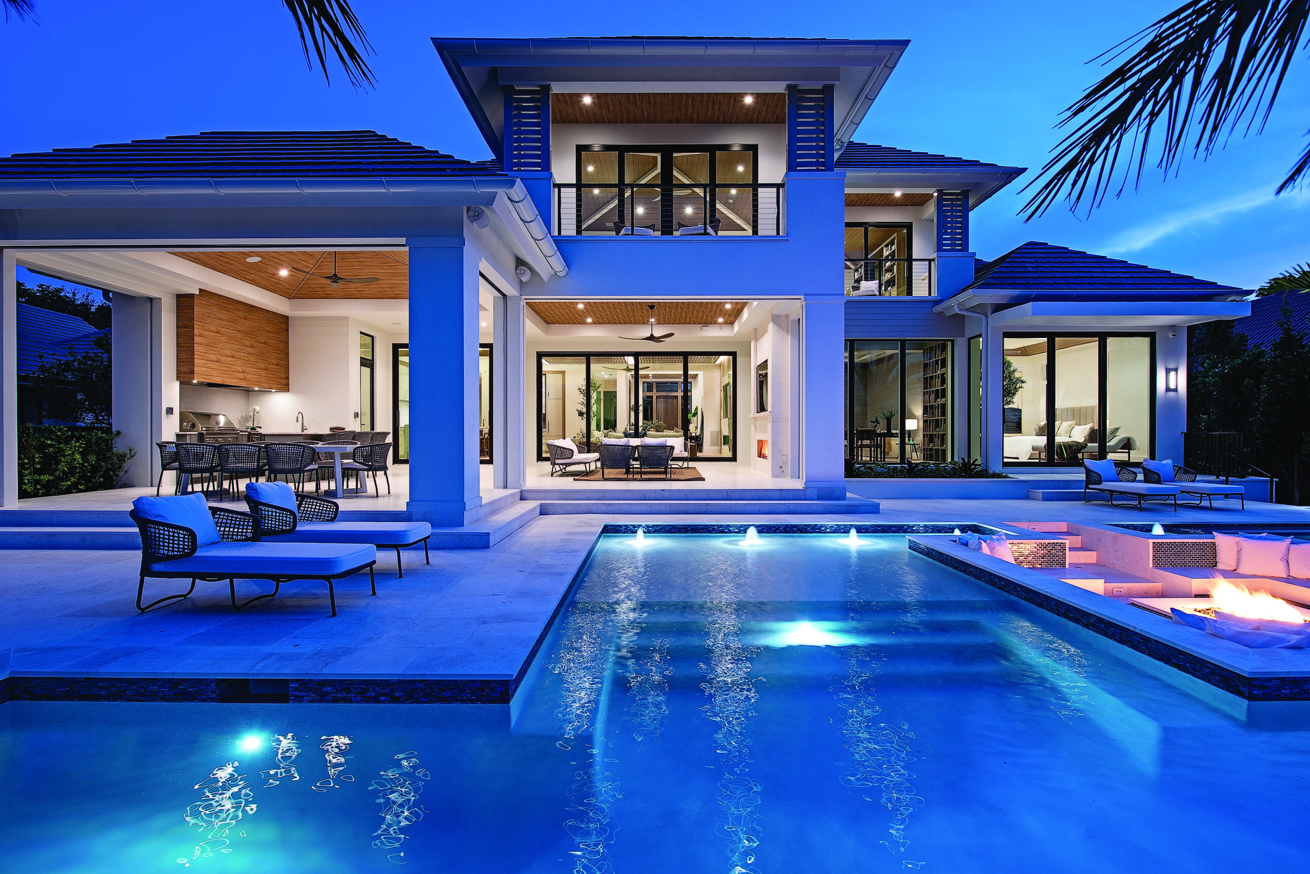 All of Waterside’s homes have a high level of finish, and prospective buyers can expect special and unexpected touches that make every home a little different. Mike likes to include unique elements, such as a club room, private dock, water wall or live wall. In this particular house, he says, “the whole pool area is breathtaking.” The back of the property features a very creative design, with a fire pit in the middle of the pool, and lots of space to lounge al fresco. “Inspired by the gracious covered outdoor living area and vast water views, we designed a wideopen social pool,” says Scott, “It is anchored by a dramatic fire pit island between a flush-level spa and a shallow sun shelf, with pool steps and an in-pool cocktail nook with ample swimming area.”